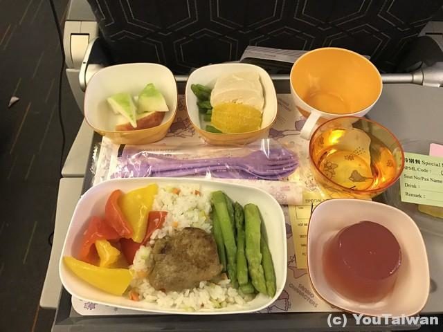 台湾の航空会社ならではの点としてベジタリアン食に中華風味付けの物がある点でしょう。