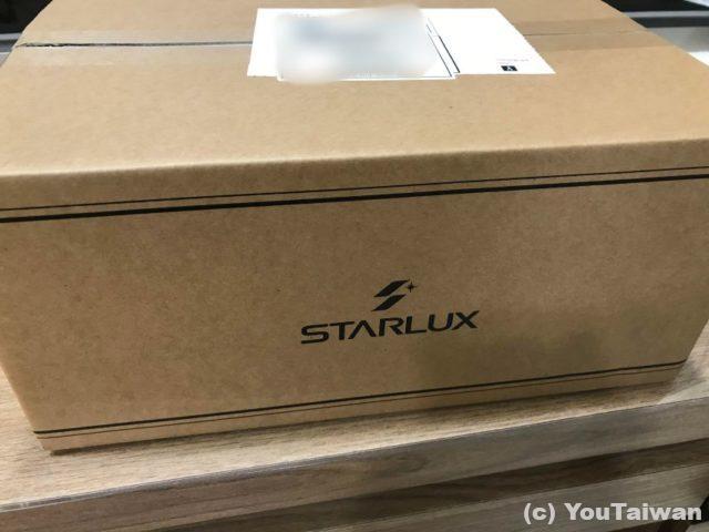 ファミマで受け取りしてみたところ梱包の箱は完全で、特に大きなダメージも有りませんでした。まず目につくのが箱に印刷されたSTARLUXのロゴです。ちょっと質感が上がった感じになっています。”Born with luxury Shining like stars. “というメッセージも箱の横に印刷されています。ブランド物航空かな?